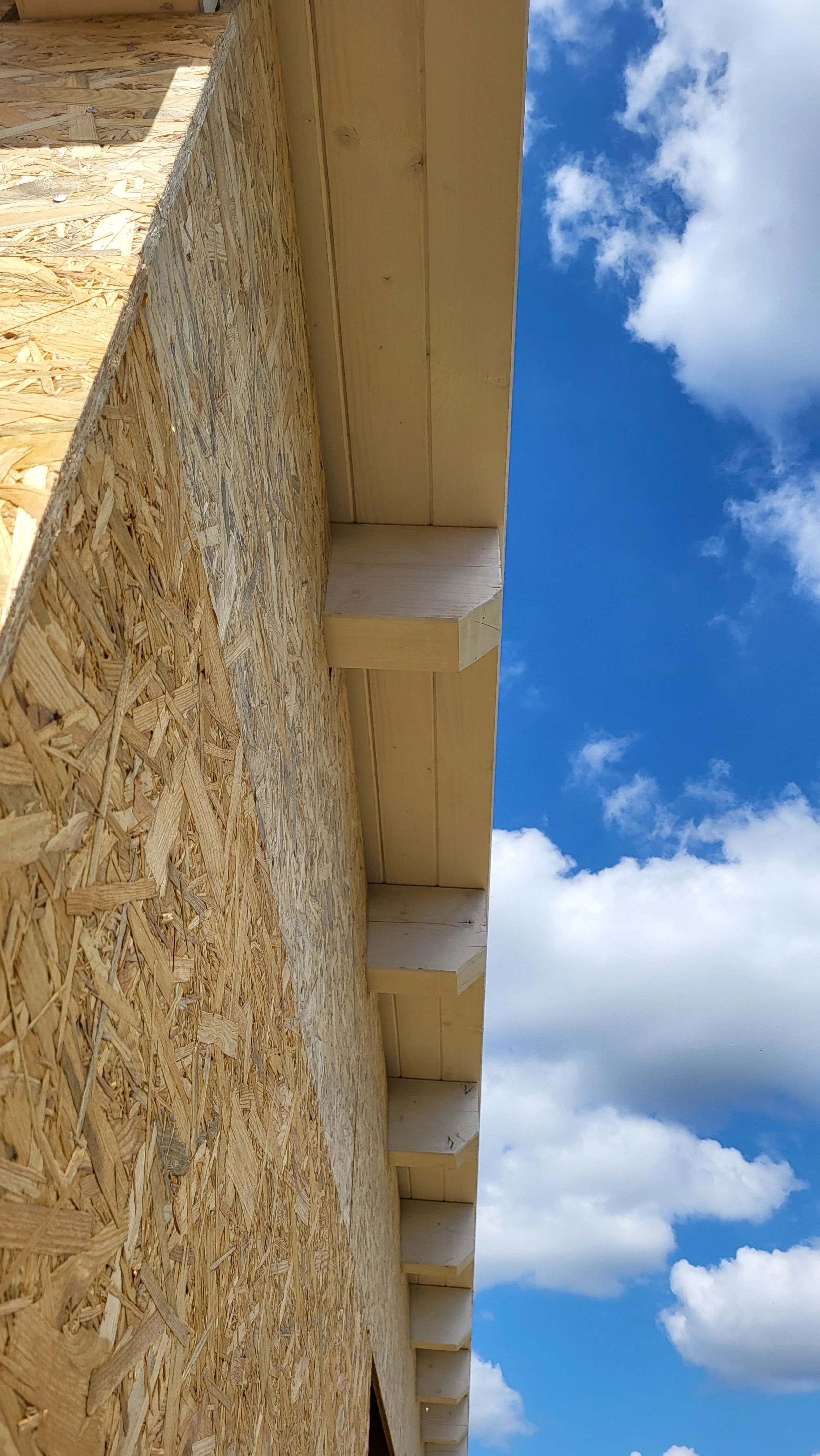 Stavba zahradního domku 80m2 Moravský KrumlovZahradní domek byl postaven z KVH profilů 6x12 na betonové pásy . Ztužen OSB deskami, na které pak přijde fasádní omítka. Pultová střecha také z KHV konstukce, pokrytá palubkovým obložením.