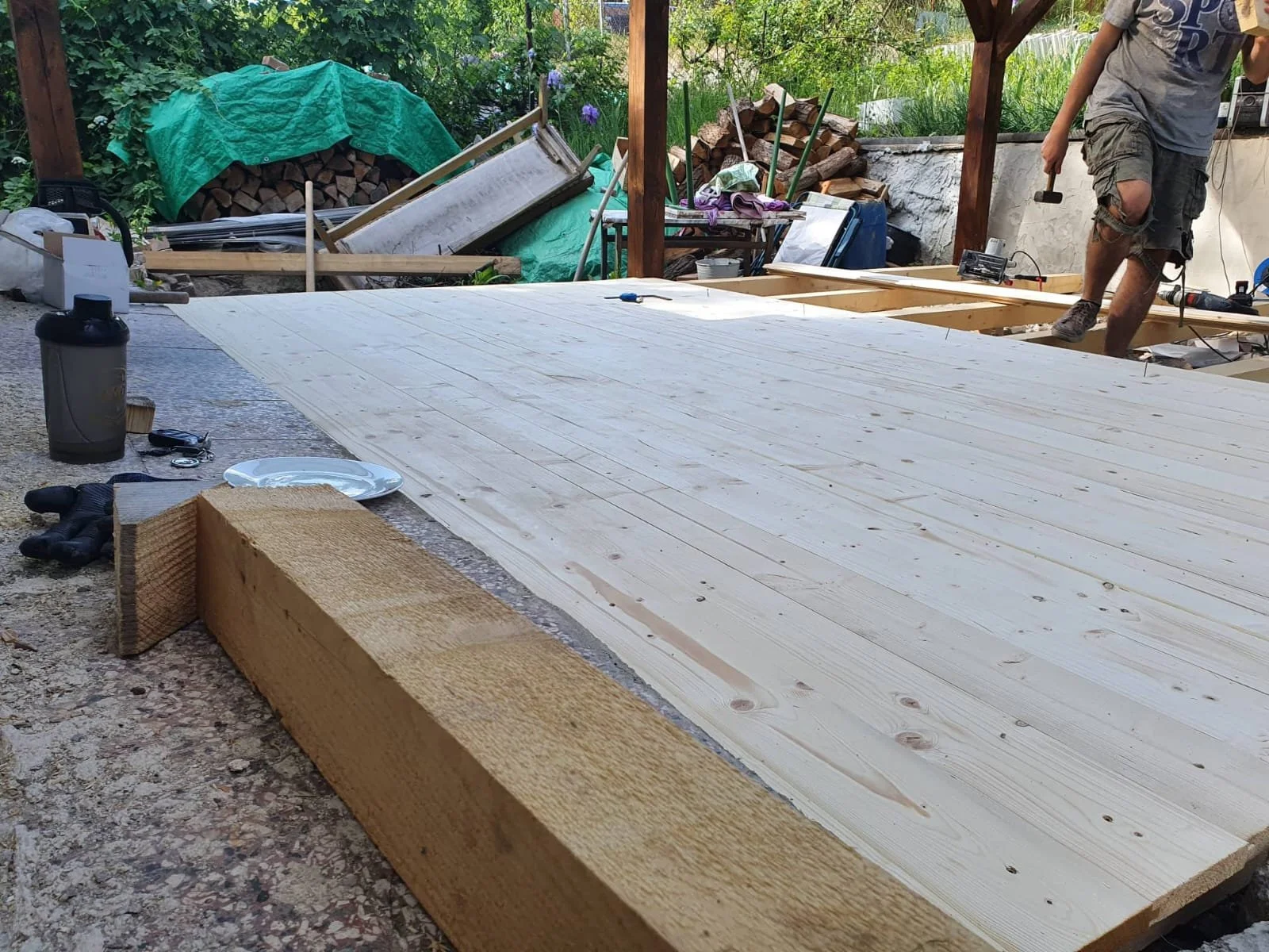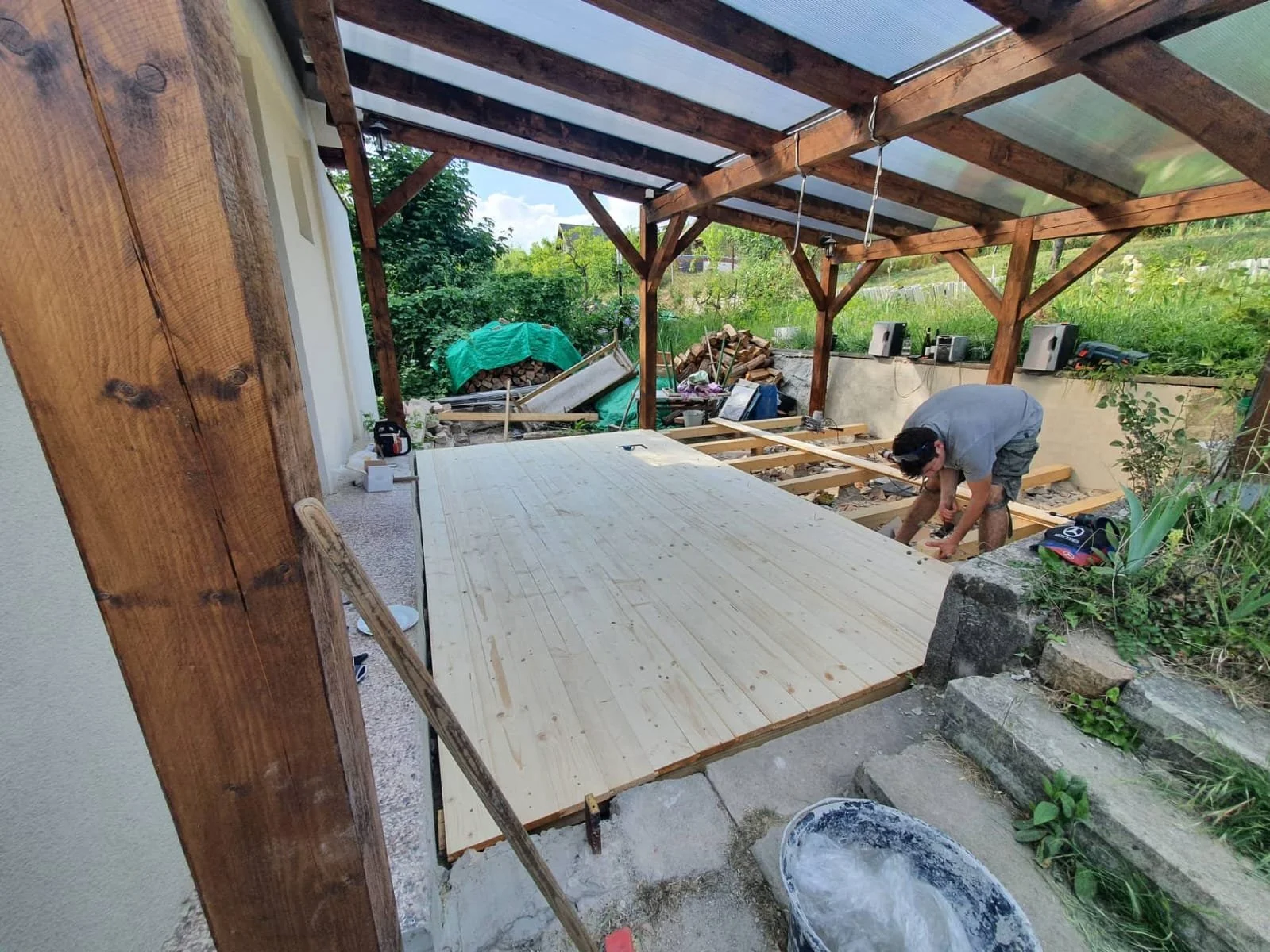 Stavba dřevené terasy 30m2 Dřevená terasa byla položena na betonové patky.Rošt byl tvořen hranolovým řezivem 10x10 a pochozí část tvoří palubková podlahovina tl. 28mm. Impregnace a lakování pochozí vrstvy byla také provedena.