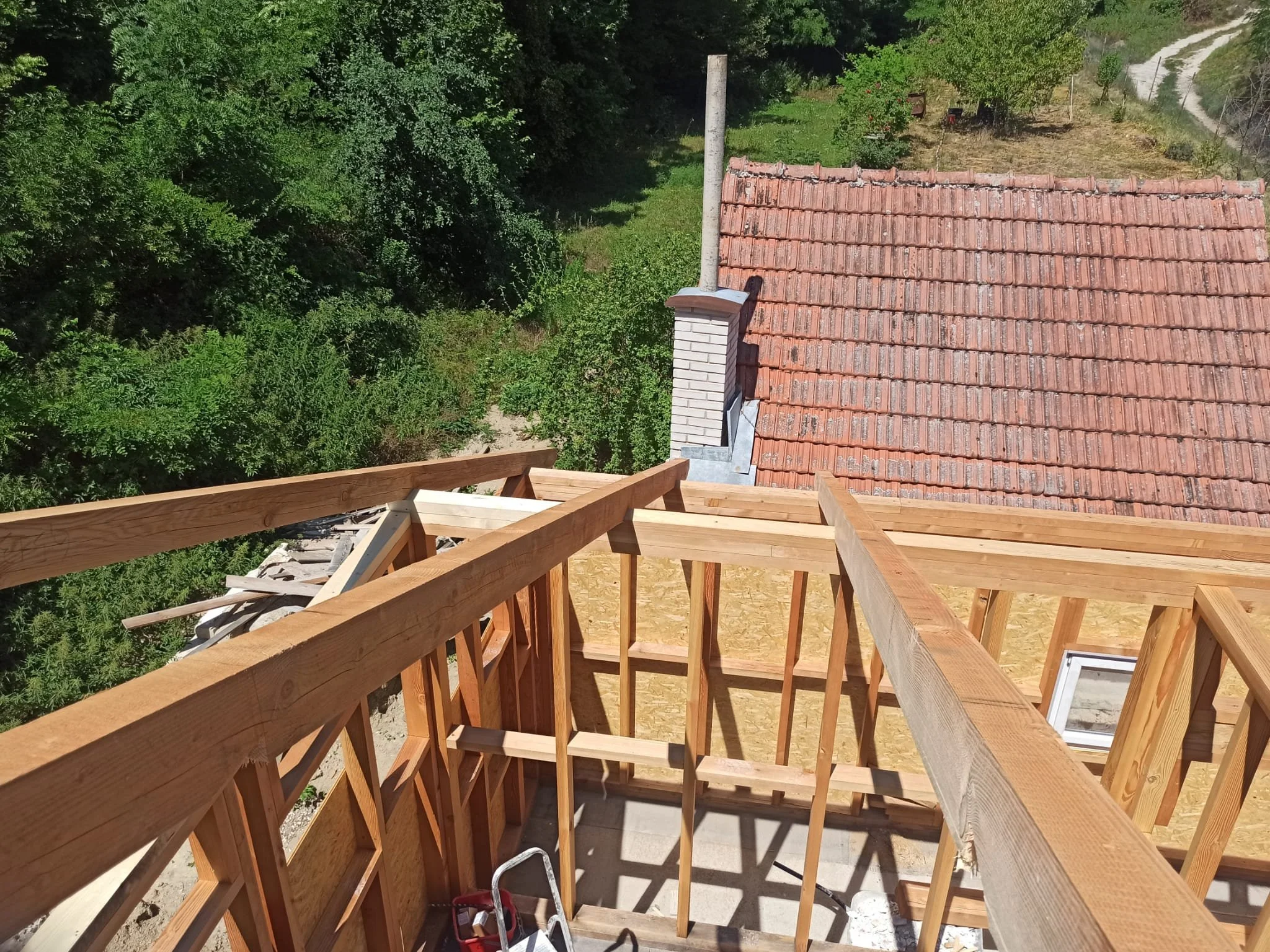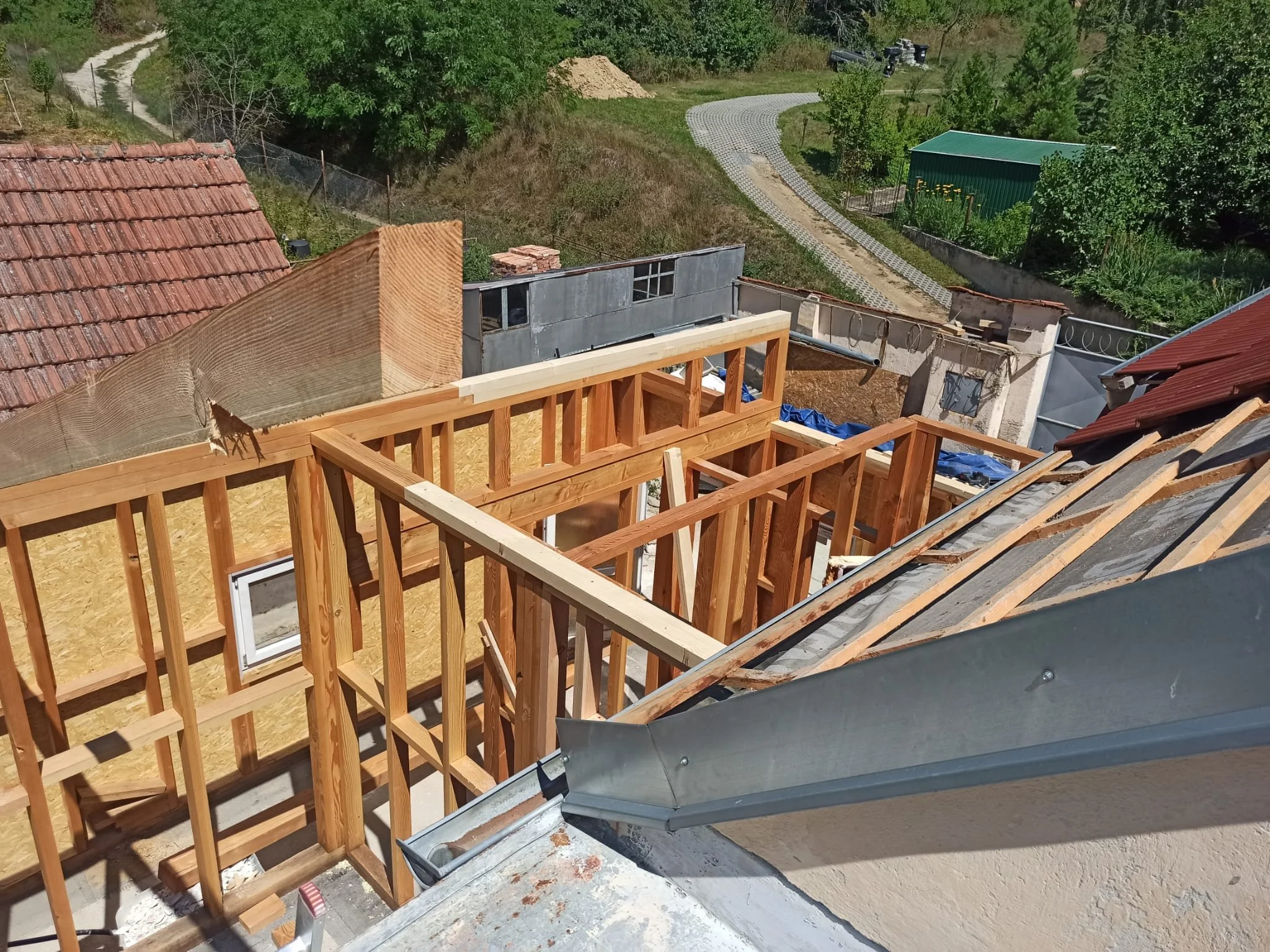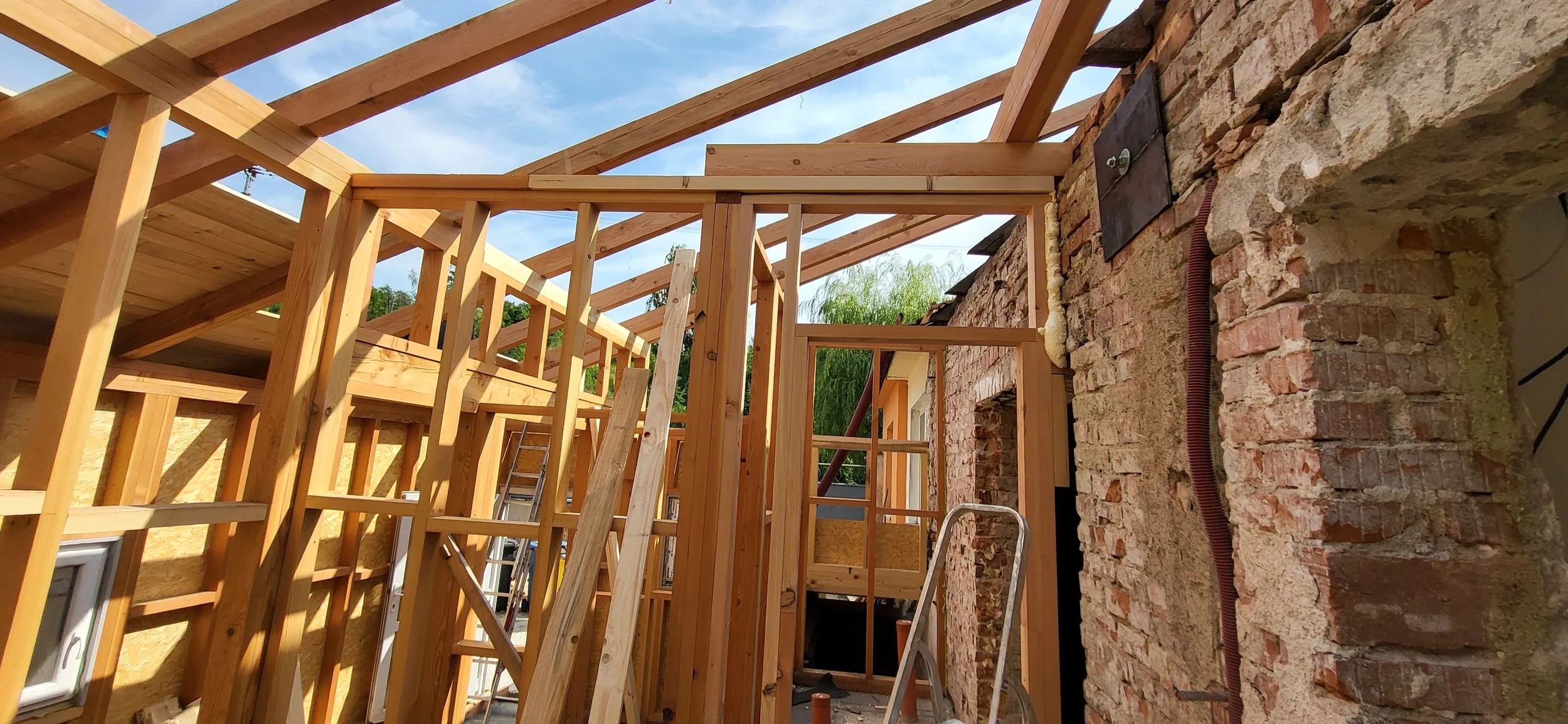 Přístavba RD domu v Dolních Kounicích. Stěny tvořeny profily 6x12 z Douglasky, stejně jako příčky 5x10. Pultová střecha napojená částečně na původní vaznicový systém střechy a částečně na nový štít.